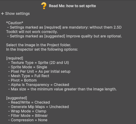 Sprites must be imported using the settings described in the contextual help panel Read Me: How to Set Sprite.